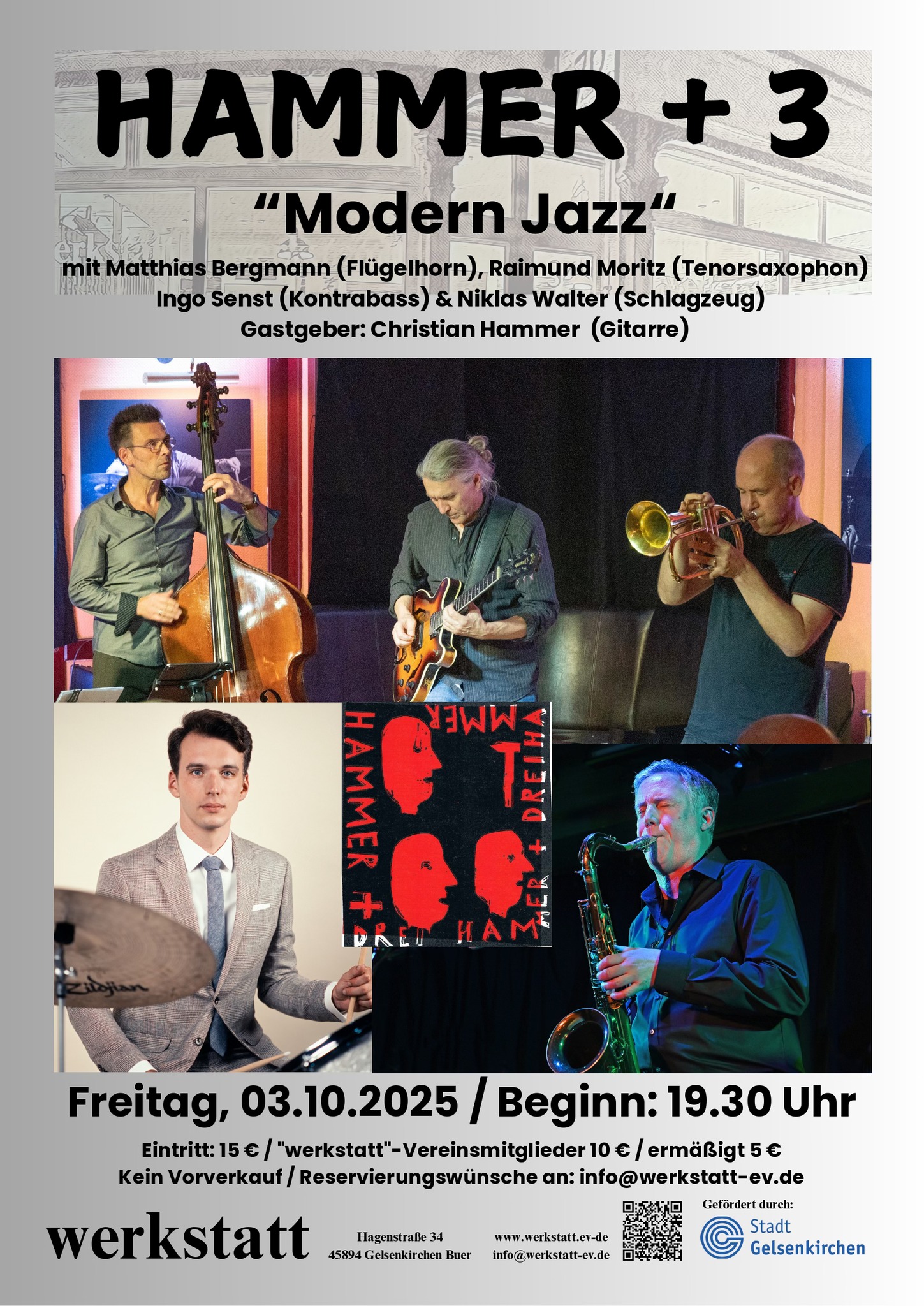 Hammer – Bergmann – Moritz – Senst – Walter @ Gelsenkirchen Veröffentlicht am21/08/202513/10/2025AutorTorpedo98 Termin Details Datum: 03/10/2025 7:30 p.m. – 10:30 p.m. Terminkategorien: Konzert Terminschlagworte: Christian Hammer, Galerie, Gelsenkirchen, Hammer + 3, Ingo Senst, Niklas Walter, Raimund Moritz, Werkstatt Matthias Bergmann tp Raimund Moritz sax Christian Hammer git Ingo Senst b Niklas Walter dr Beginn 19.30h werkstatt Verein zur Förderung von Kunst und Kultur e.V. / Hagenstr. 34 / 45894 Gelsenkirchen / info@werkstatt-ev.de 03.10.2025 / „Hammer +3“ – Modern Jazz