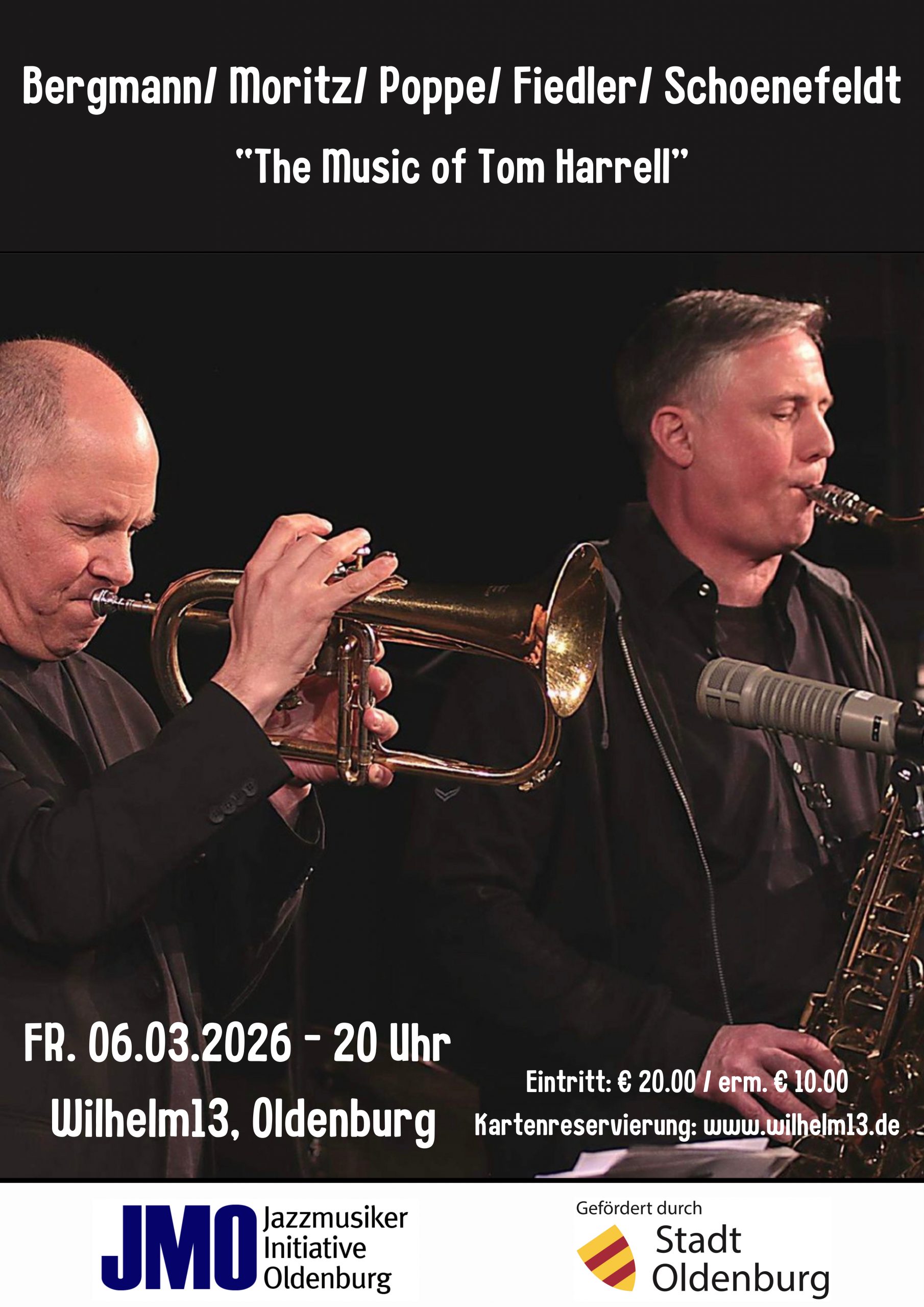 Der Jazztrompeter Matthias Bergmann hat für diesen Abend seine persönlichen Favourites aus dem Oeuvre Harrells zu einem spannenden Programm zusammengestellt, die neben ihm von Raimund Moritz am Tenorsaxophon, Oli Poppe am Klavier, Frank Fiedler am Bass und Christian Schoenefeldt am Schlagzeug eindrucksvoll interpretiert werden.